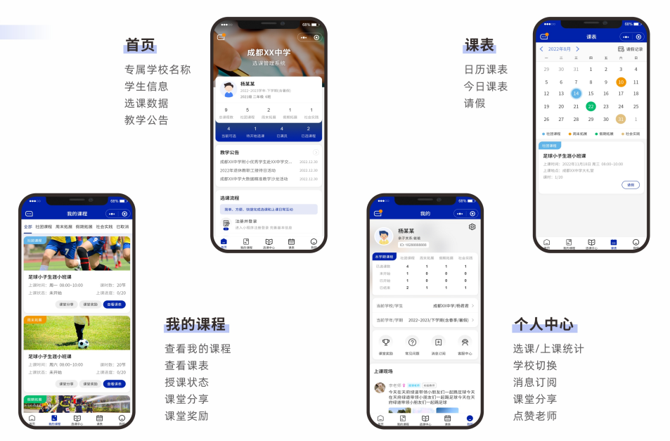校园素质拓展小程序家长端:首页 专属学校名称 学生信息 选课数据 教学公告,课表 日历课表 今日课表 请假,我的课程 查看我的课程 查看课表 授课状态 课堂分享 课堂奖励,个人中心 选课/上课统计 学校切换 消息订阅 课堂分享 点赞老师